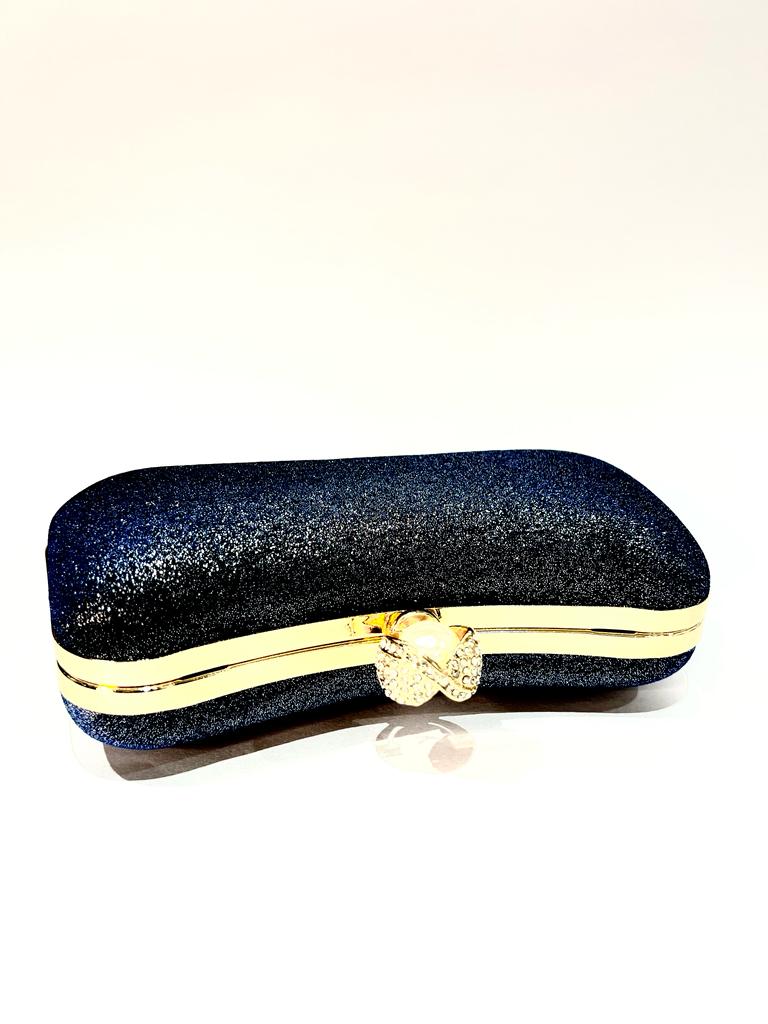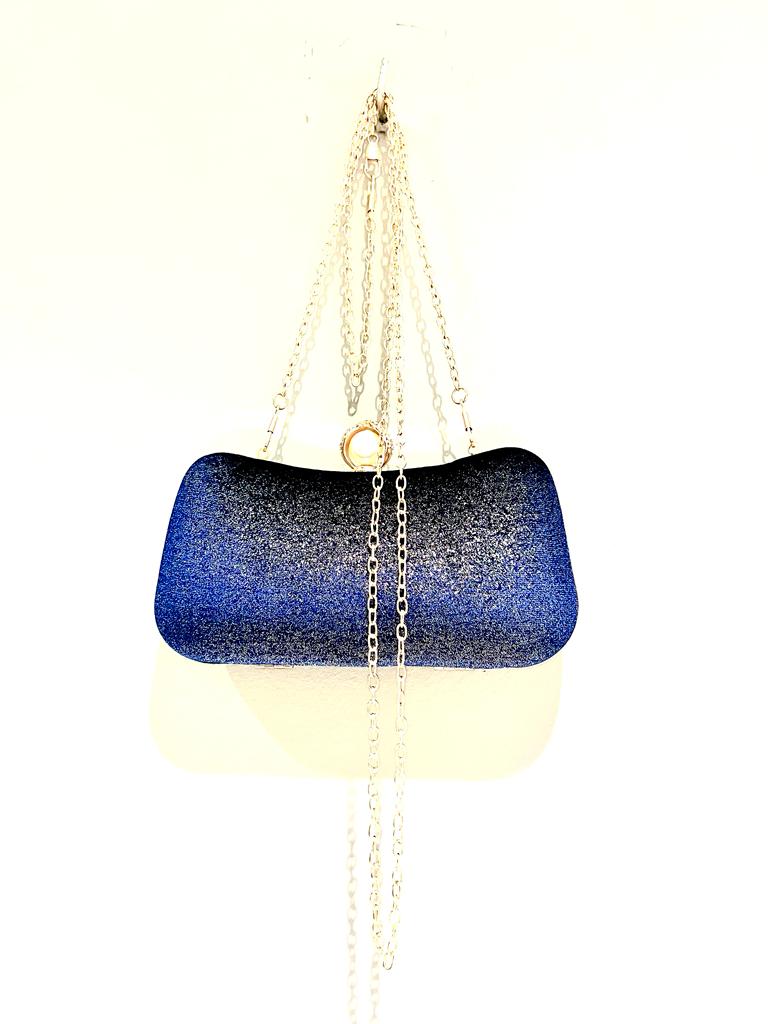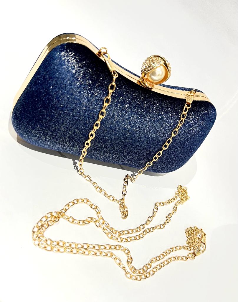 Bolsa para festa, azul purpurina, fecho em pérola shell e zirconias. Aprox. 11cm Alt X 20cm Larg.